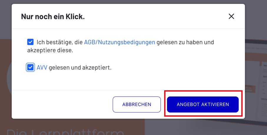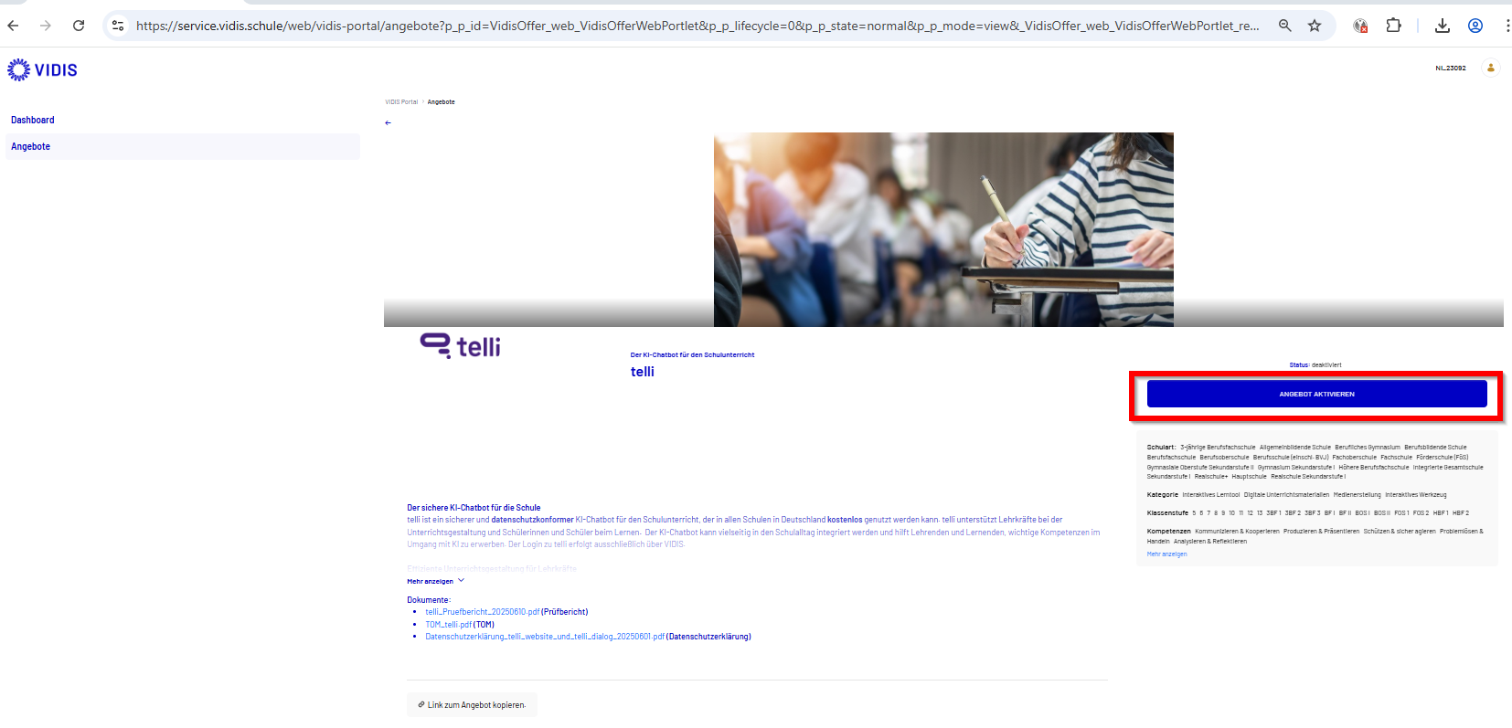 - Weiterhin kann hier das Angebot für die Schule aktiviert werden. Dazu ist auf den blauen Button „Angebot aktiveren” zu klicken.