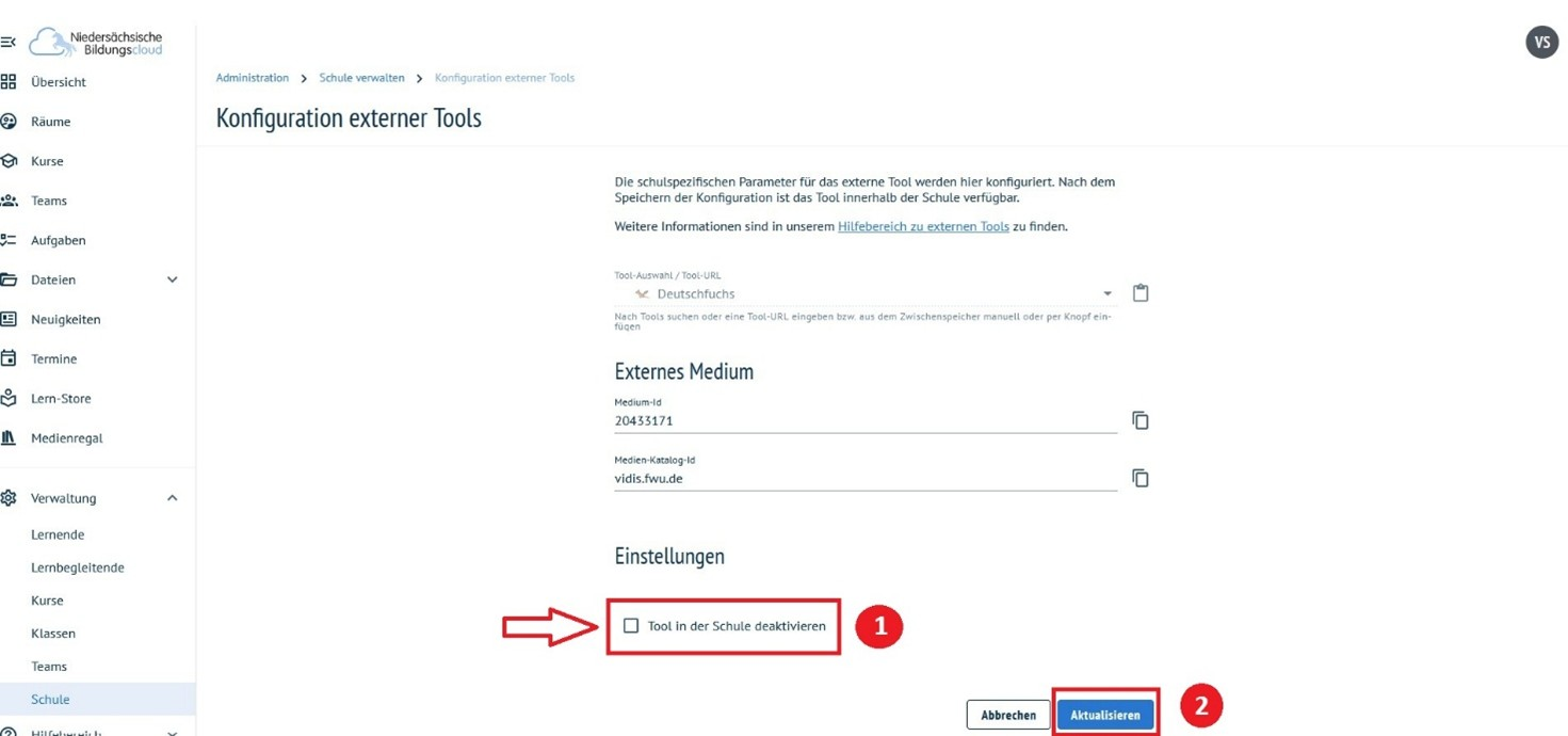 Button "Bleistift" (3):Durch Klicken des Bleistift-Buttons öffnet sich ein neues Fenster. Hier ist es möglich, das Tool wieder zu deaktivieren. Dazu ist ein Haken bei „Tool in der Schule deaktivieren” (1) zu setzen. Anschließend ist die Änderung mit einem Klick auf den Button „Aktualisieren” (2) zu speichern.