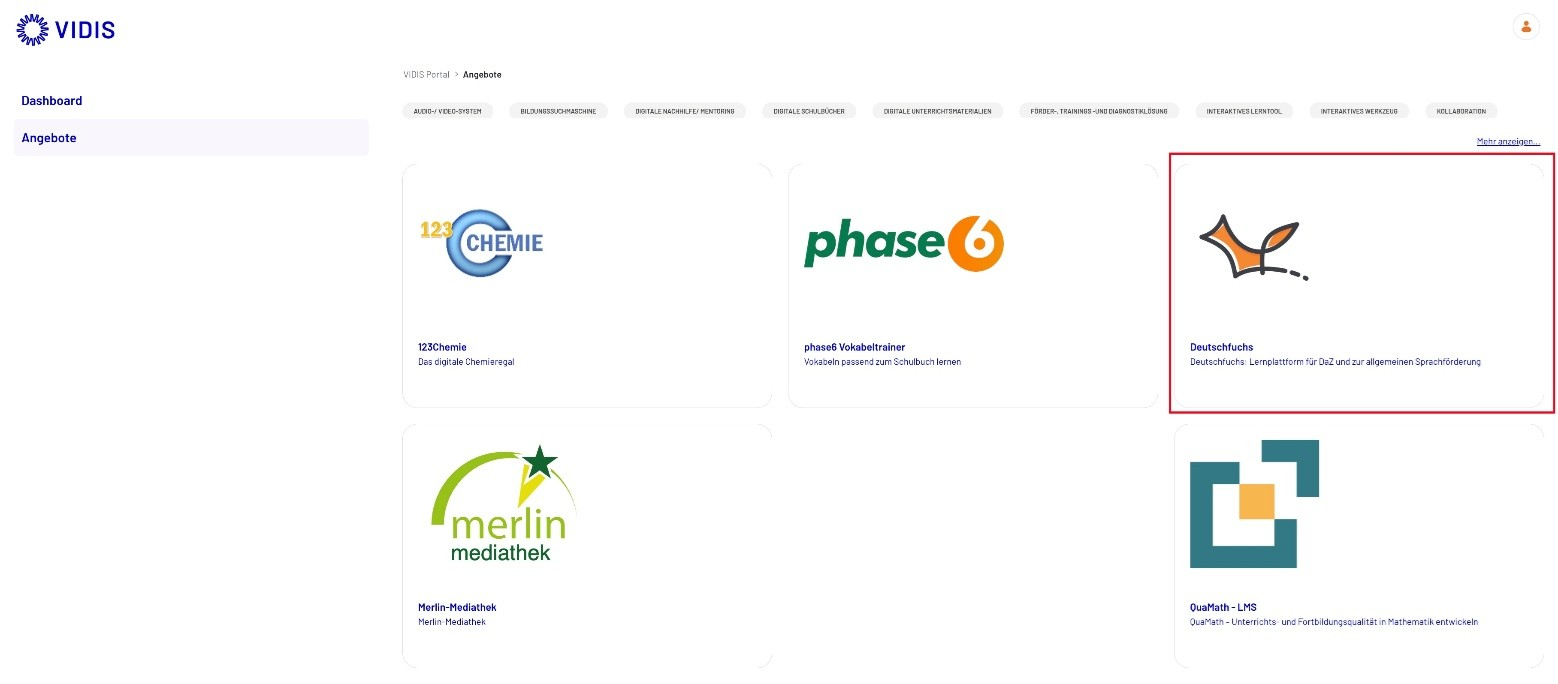 - Es erscheint eine Übersicht mit verschiedenen Anwendungen, die über VIDIS freigeschaltet werden können.