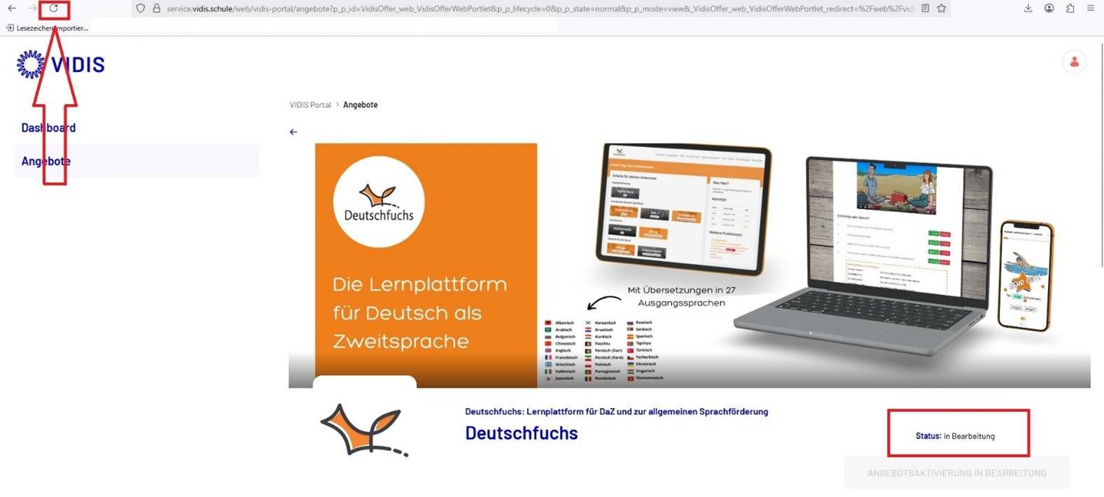 - Für eine aktuelle Ansicht ist die Seite einmal neu zu laden, indem neben der URL-Zeile des Browserfenster der Button zum Aktualisieren der Seite geklickt wird.