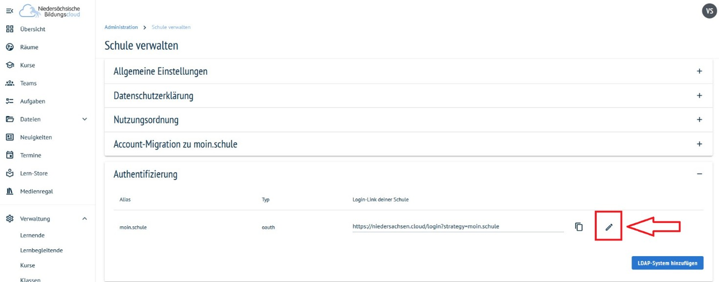 - Nun in der Zeile mit dem Alias „moin.schule" auf das Bleistift-Symbol klicken, um weitere Einstellungen vornehmen zu können.