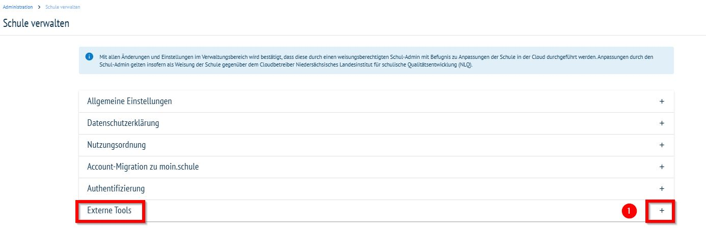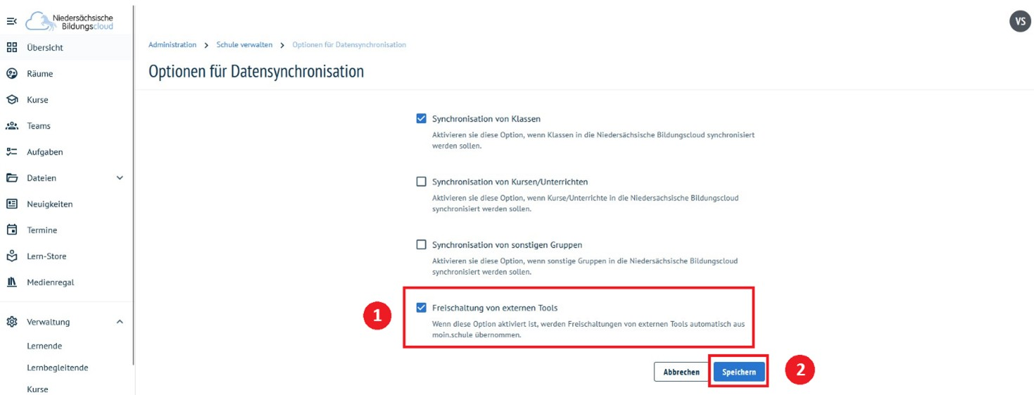 - Hier ist ein Haken bei dem Punkt „Freischaltung von externen Tools" (1) zu setzen. Dieser Haken ermöglicht, dass in moin.schule freigeschaltete Anwendungen direkt auch in der NBC freigegeben sind.